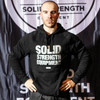 Solid Strength Equipment unisex pullover hoodie in black with silver print. Details: Regular fit, mid weight, 290 GSM, 80% cotton, 20% polyester anti-pill fleece, pullover hood, raglan sleeves, kangaroo pocket, lined hood, tonal drawcord, sleeve cuff ribbing, preshrunk to minimise shrinkage.